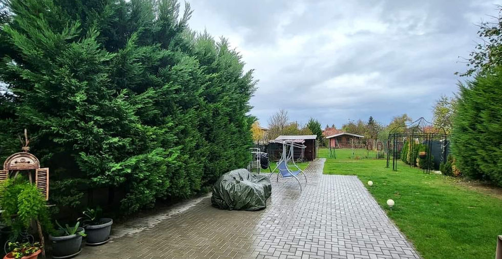 Curte amenajată cu flori, pomi fructiferi și gazon, plus sistem propriu de irigare